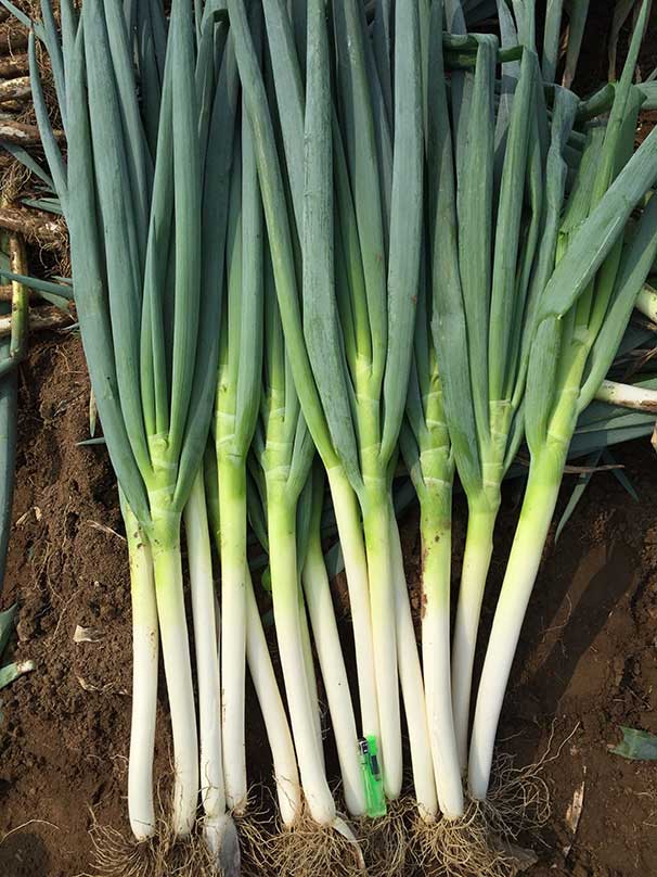 生长快速,一代交配品种。叶片浓绿紧凑,葱白长40cm,抗寒性、抗病性强,产量高, 装箱美观,适合加工出口。