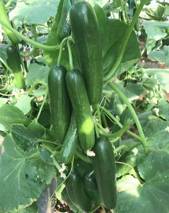 Hybrid F1. Vigorous growth, straight , smooth with slightly ribbed skin, 14-16cm long, dark green color, strong fruit setting ability, suitable for spring and autumn cultivation.